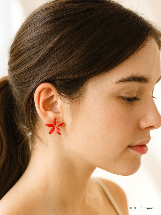 Magnifiques boucles d'oreilles rouges en nacre en forme de fleur et plaqué or 1 micron. Ajoutez une touche de couleur et d'élégance à votre tenue avec ces boucles d'oreilles uniques. Parfaites pour une soirée spéciale ou une journée au bureau.